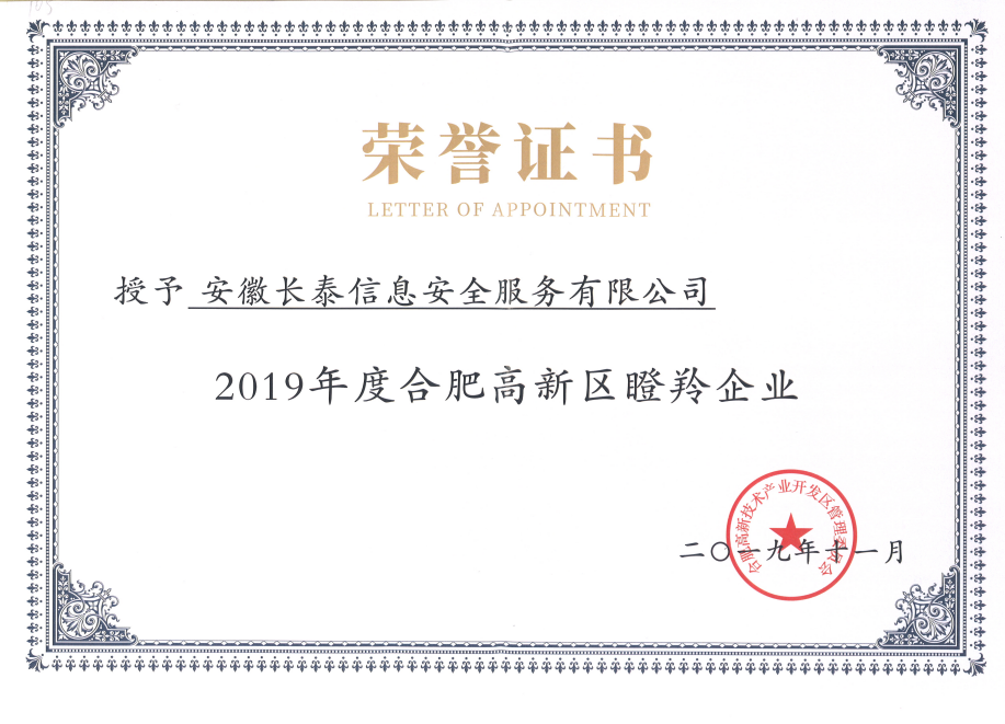 2019年,11月20日,合肥高新区2019年高成长企业榜单正式发布,高新区共认定了502家高成长企业,其中雏鹰企业275家、瞪羚培育企业72家、瞪羚企业149家、潜在独角兽企业3家、独角兽企业1家、平台型龙头企业2家。作为其中的高科技企业——安徽leyu·乐鱼(中国)体育官方网站成功入选瞪羚企业榜单。